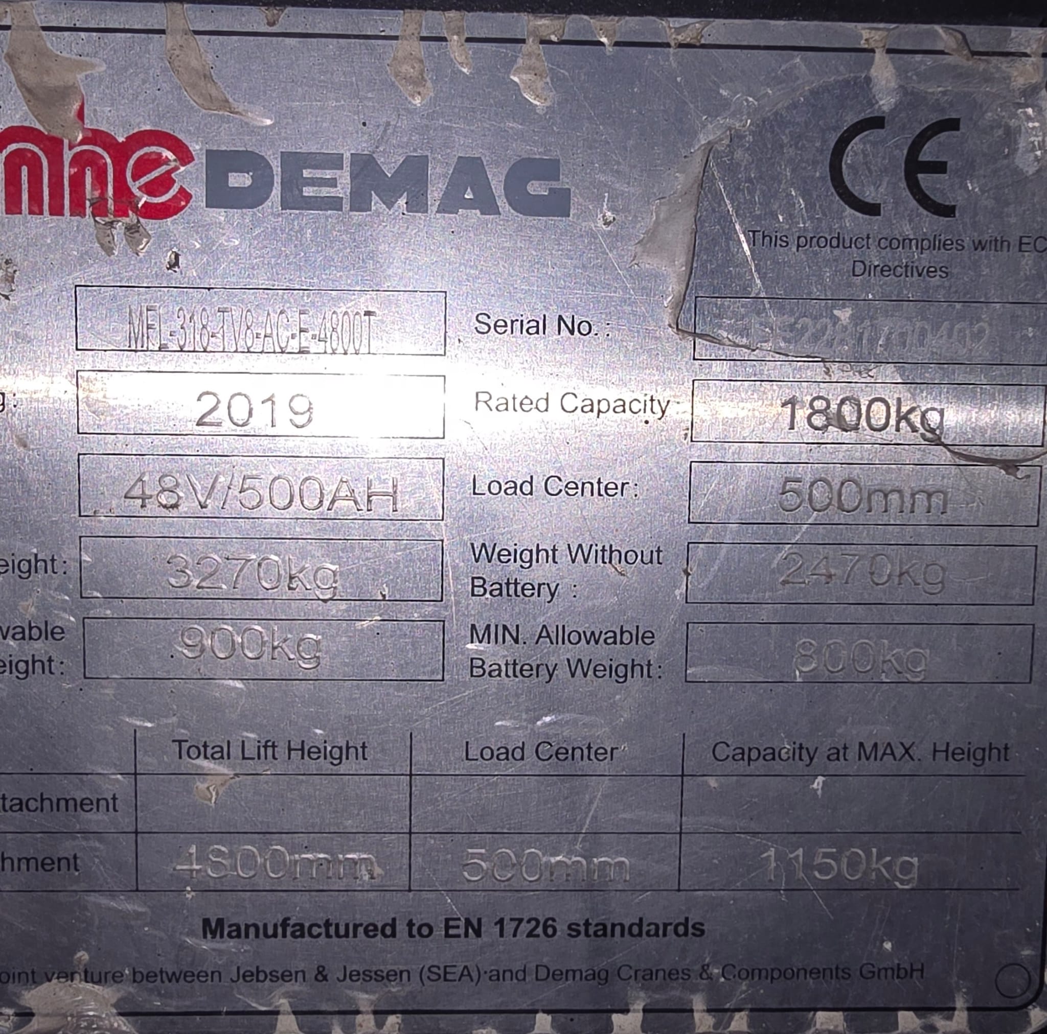 1800 kg lifting capacity with 500 mm load center for stable operation.