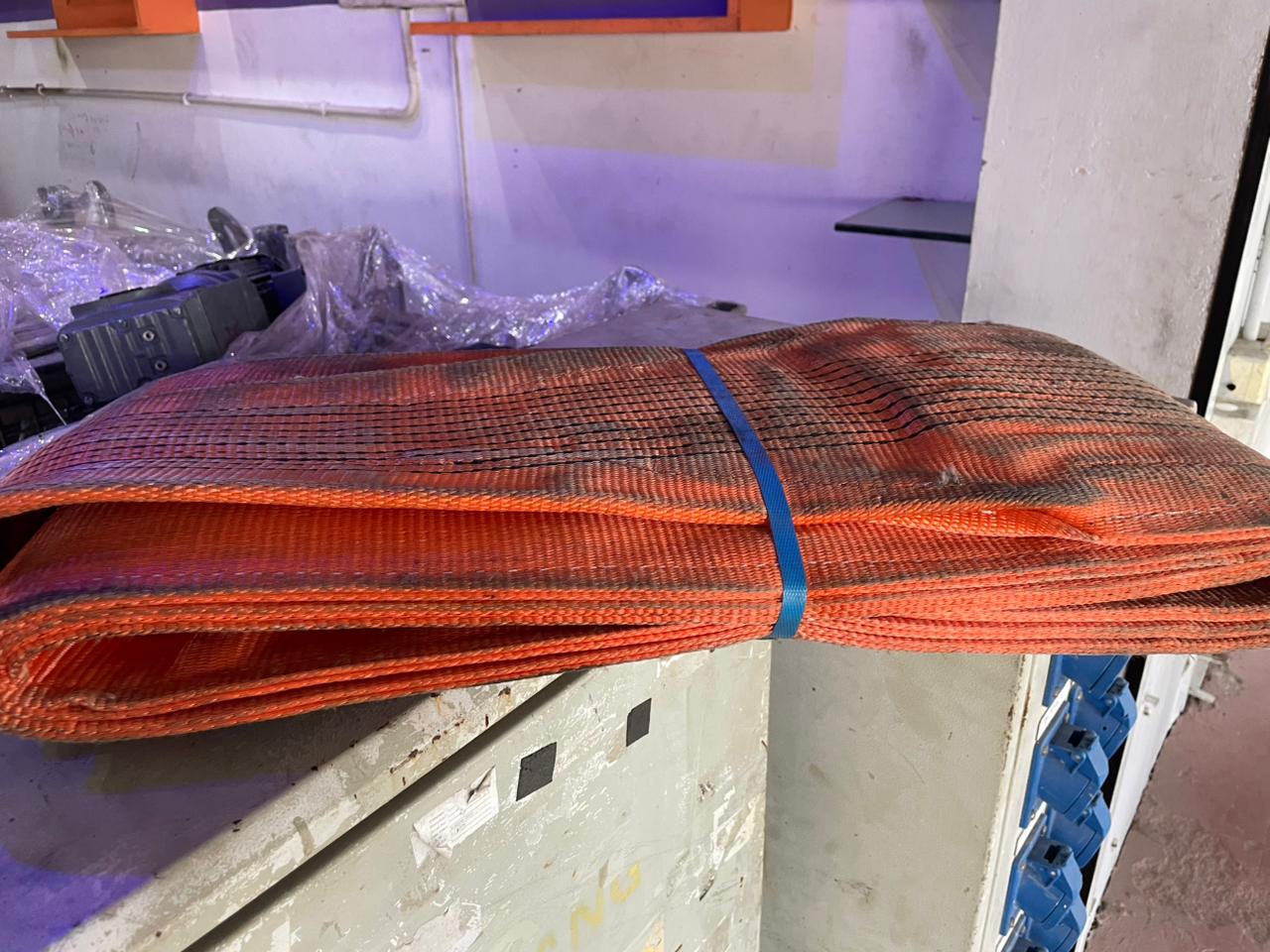 - Heavy-duty polyester flat webbing sling suitable for industrial lifting operations.